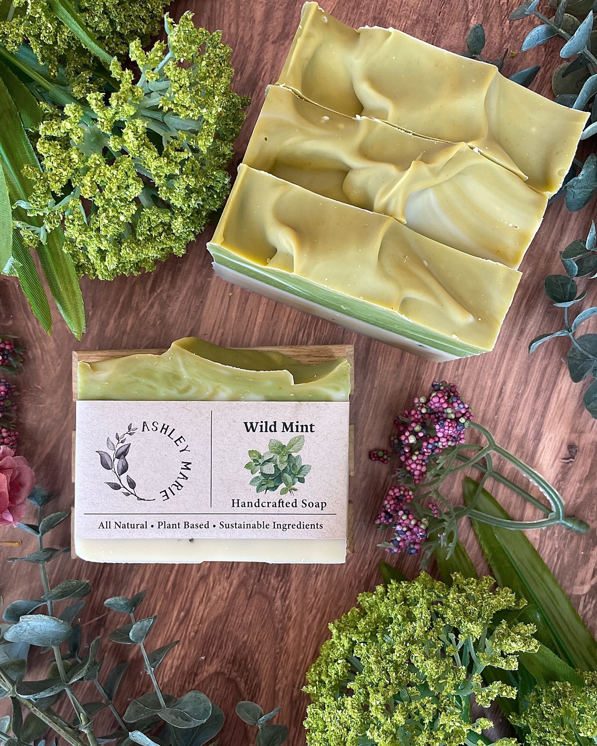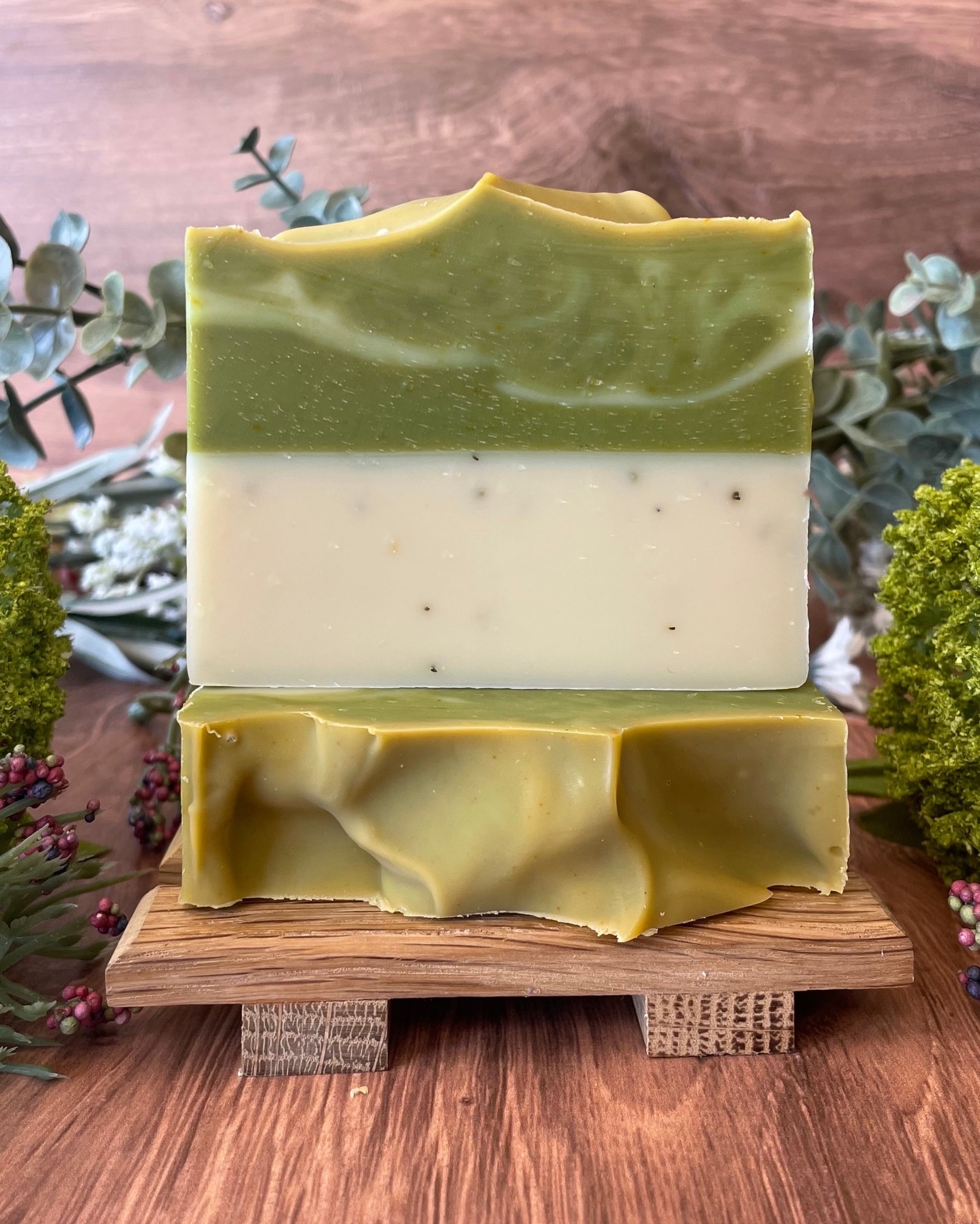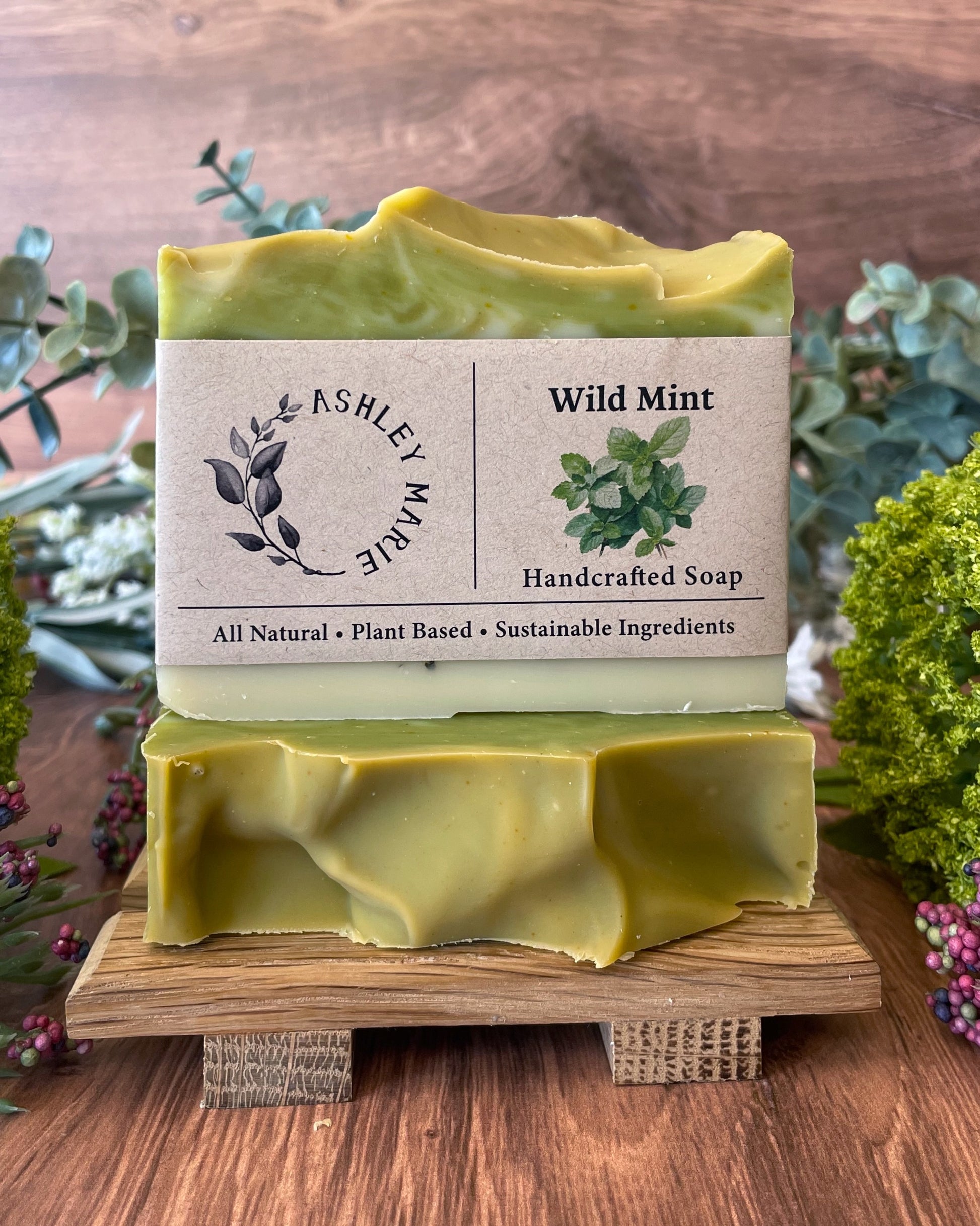 Awaken your senses with Wild Mint, a crisp and refreshing soap that captures the essence of Spring. Crafted with a revitalizing essential oil blend of peppermint, spearmint, and a hint of vetiver, this bar delivers a cool, minty freshness with a touch of earthy depth. Naturally colored with a beautiful green infusion of alfalfa powder, it reflects the lush vibrancy of the season. Perfect for a refreshing cleanse, Wild Mint is a must-have for spring! Available for a limited time—grab yours while supplies last!