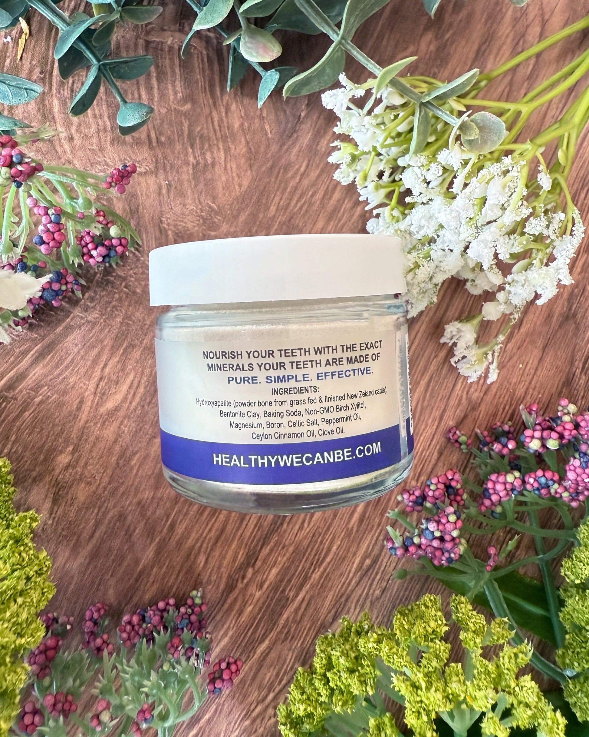 None-nano Hydroxyapatite (powdered bone from grass-fed cattle), White Kaolin Clay, Sodium Bicarbonate, Non GMO Xylitol (sourced from hard wood), Magnesium, Calcium, Boron, Celtic Salt, Organic Peppermint, Ceylon Cinnamon, Spearmint and Clove Oil.