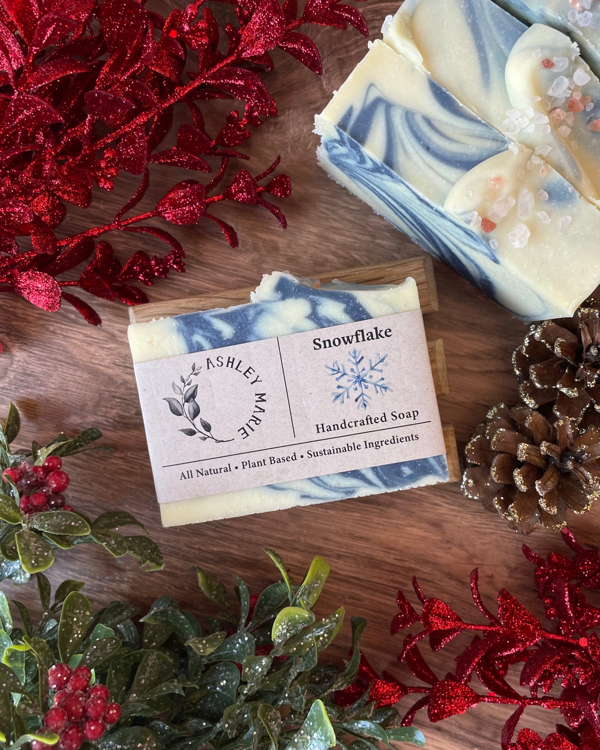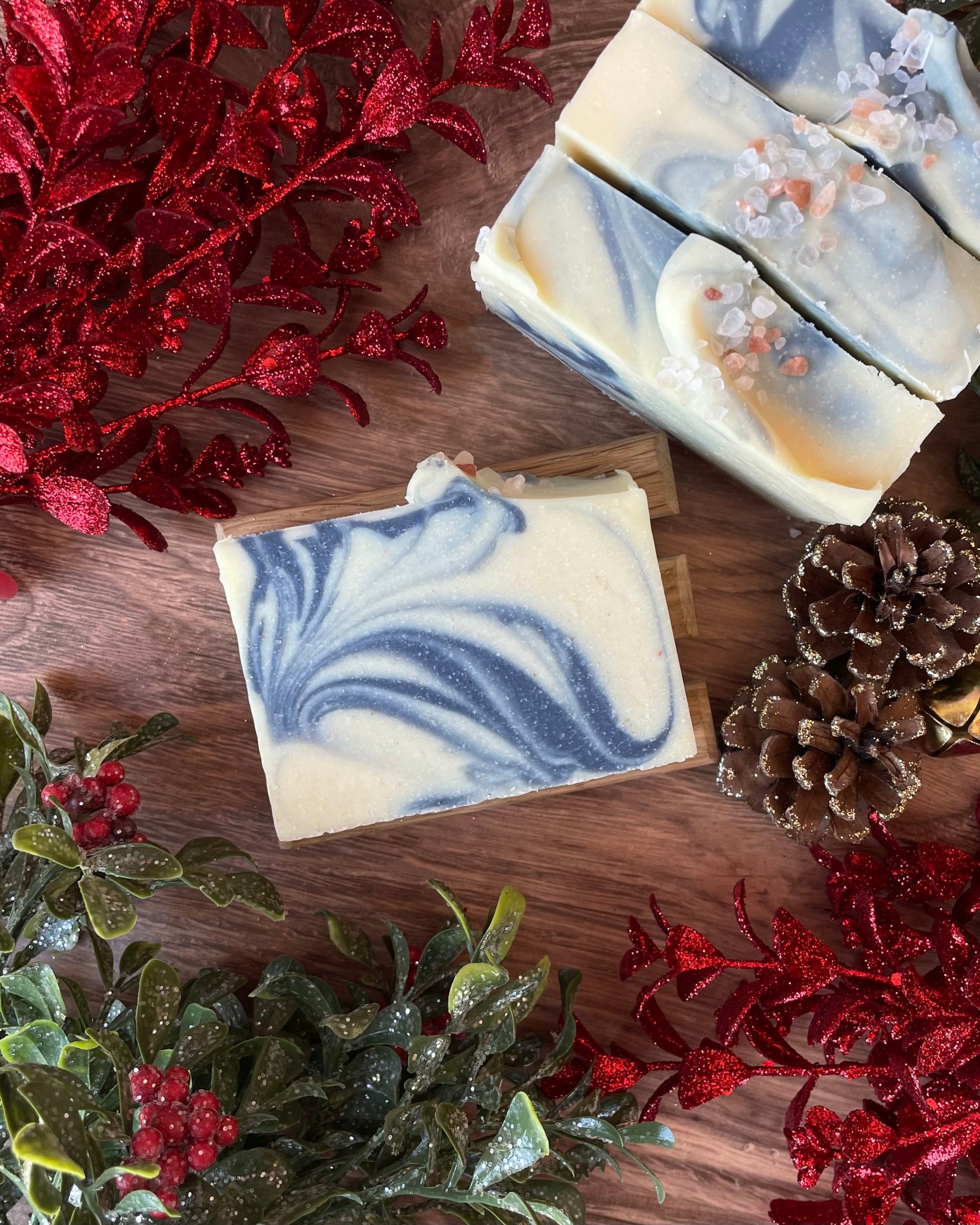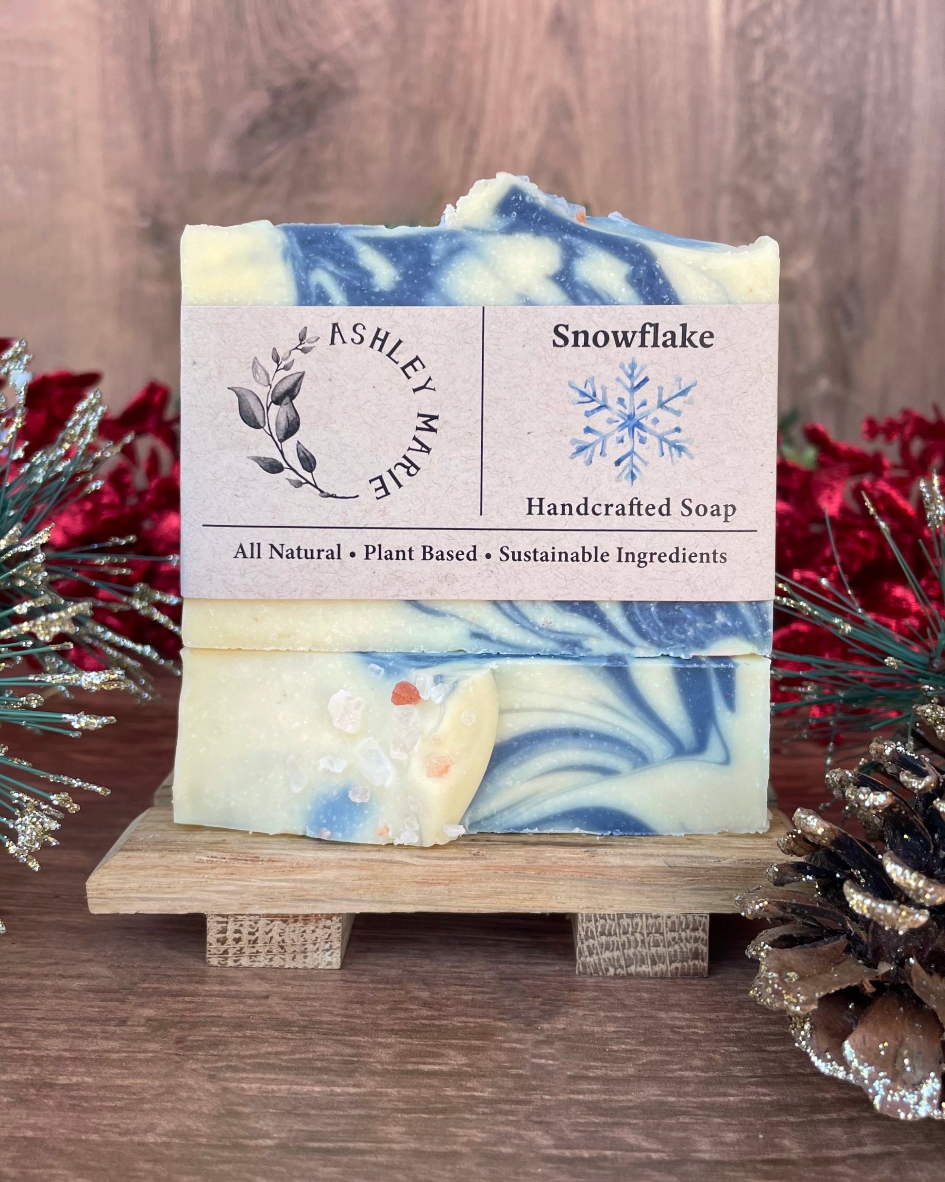 Introducing Snowflake, the newest addition to our Christmas collection and a true seasonal beauty. Made with Himalayan salt, this bar offers a gentle exfoliation, perfect for winter skin that needs a little extra care. Its refreshing scent is as crisp and invigorating as a snowy morning, while the white and soft blue swirls—crafted with natural indigo colorant—capture the serene elegance of a winter landscape.